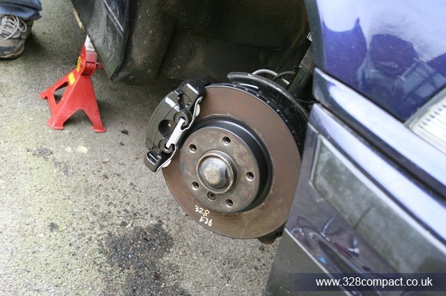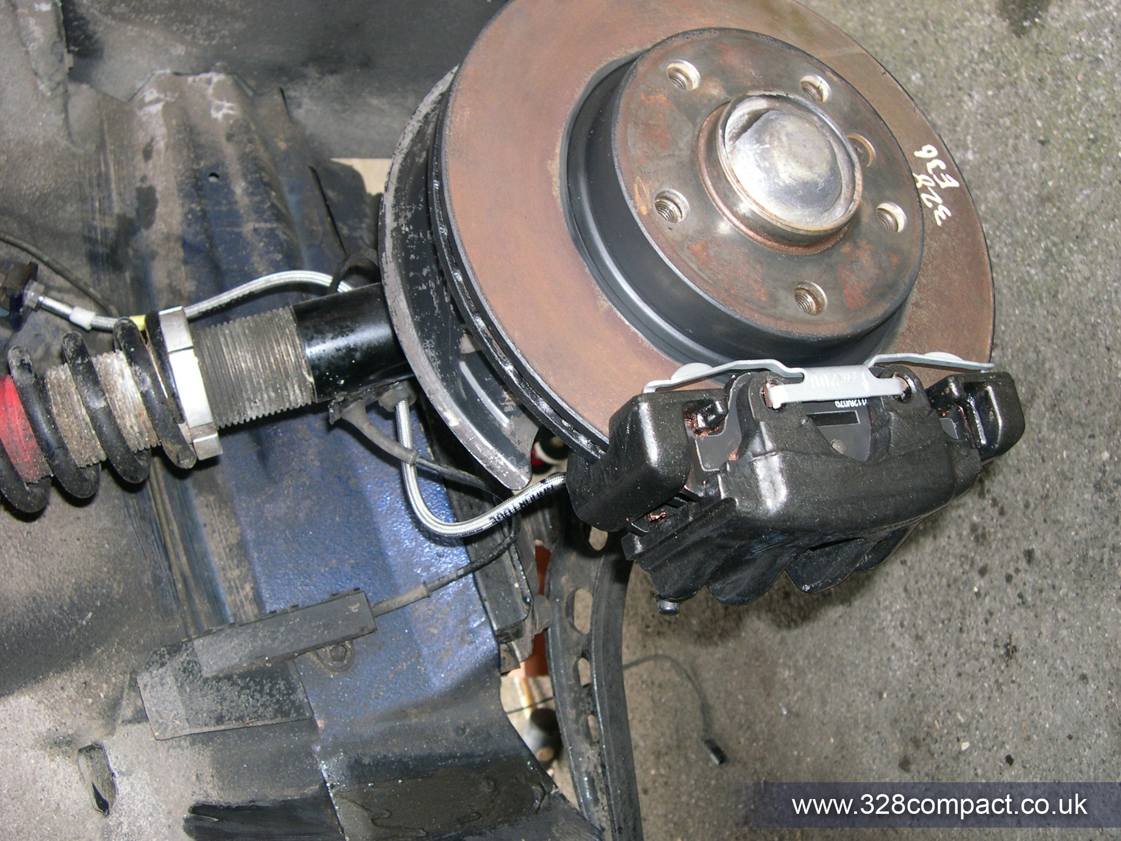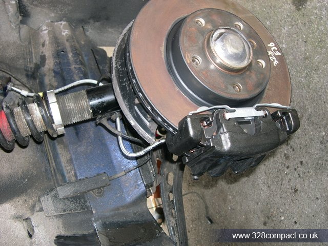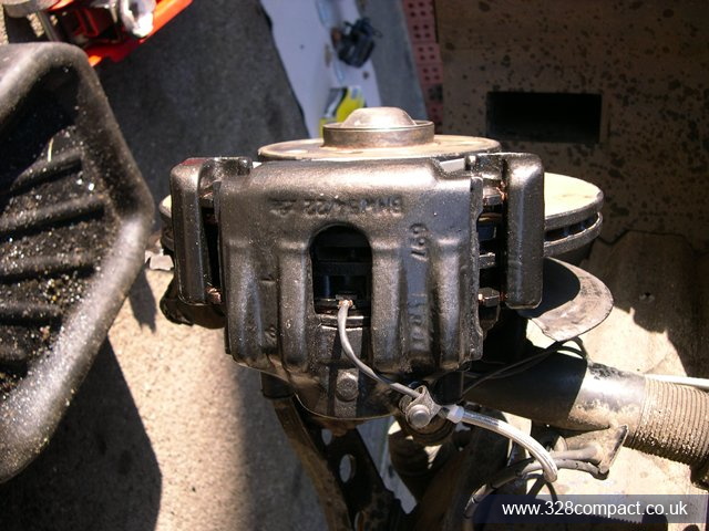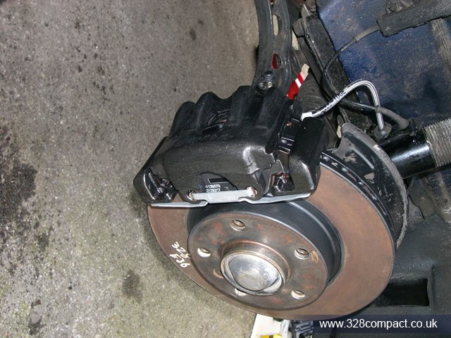 After removing the disks and callipers from the wheel hub the new disks and calliper carriers were attached. The new brake pads were given a layer of copper grease in all the areas they contact the calliper to prevent any squeaking. With all the preparation done the old calliper and its brake hose were removed. (All the brake hoses are being replaced with Goodridge metal braded ones)