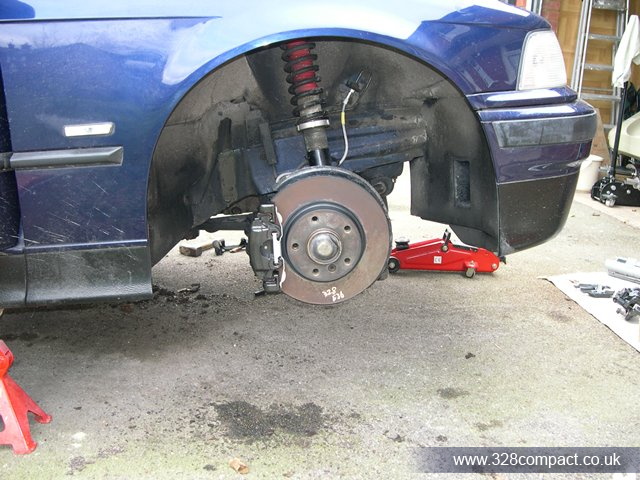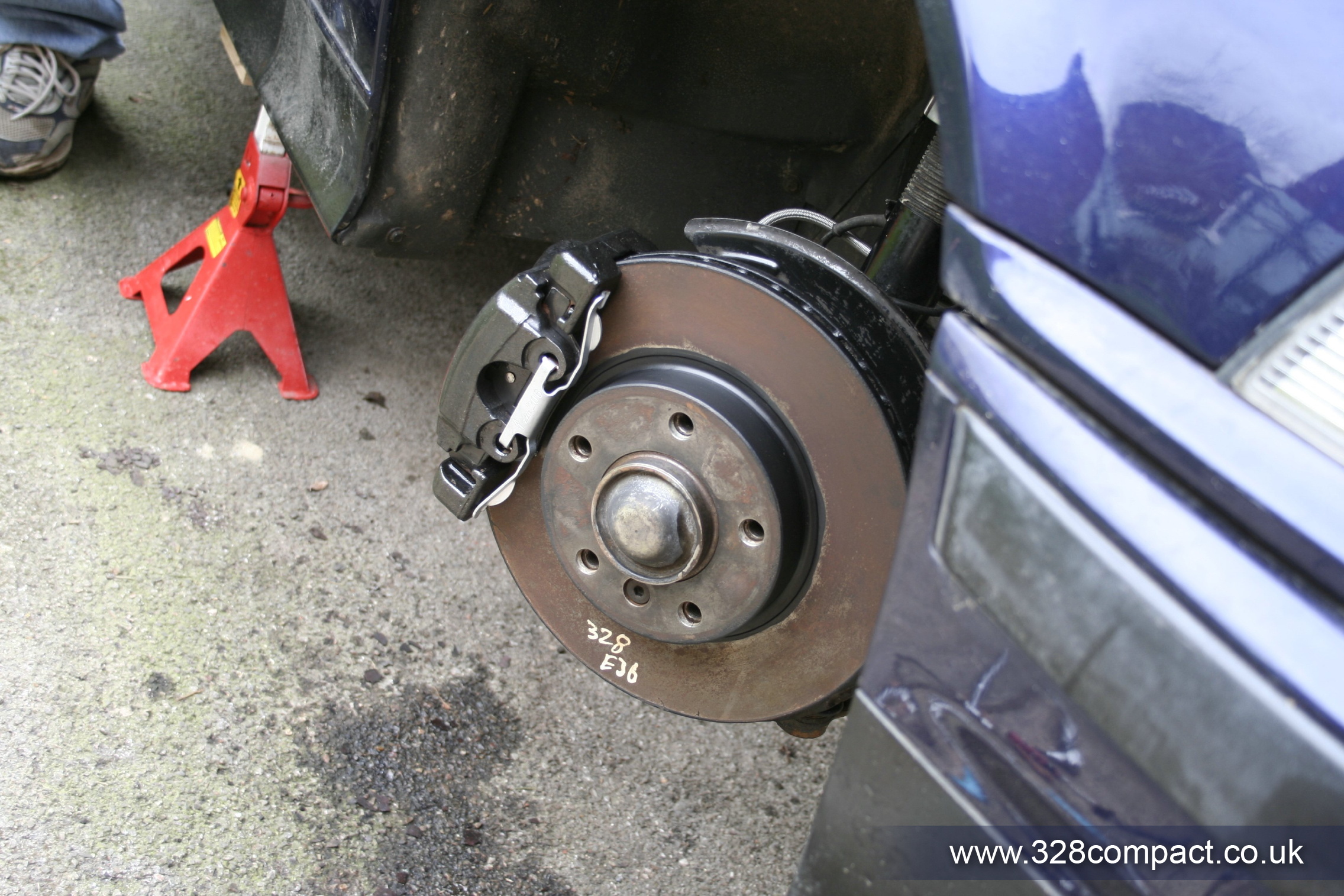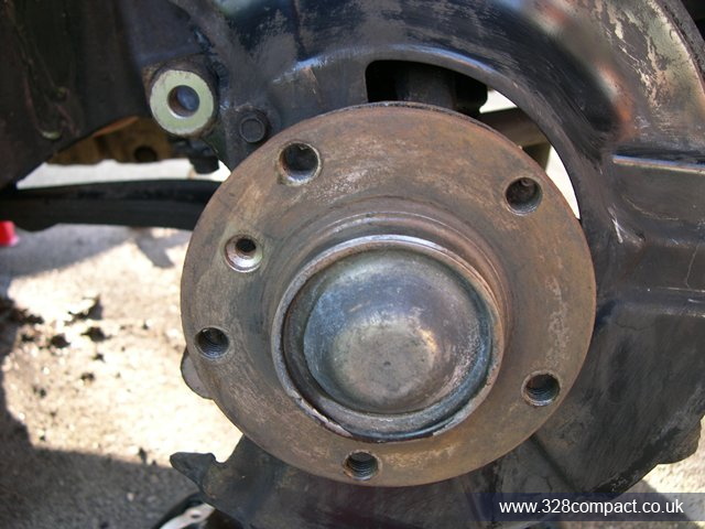 The first stage was to remove the current callipers and disks. After spend a fair amount of time struggling to get large breaker bars in under the wheel arch to remove the calliper bolts, a thought occurred. How about turning the wheels so the bar can be used outside the wheel arch! Doh should of thought of that sooner. With the wheels turned it’s easy to undo the calliper bolts. The following picture shows the wheel hub with the disk and calliper removed.