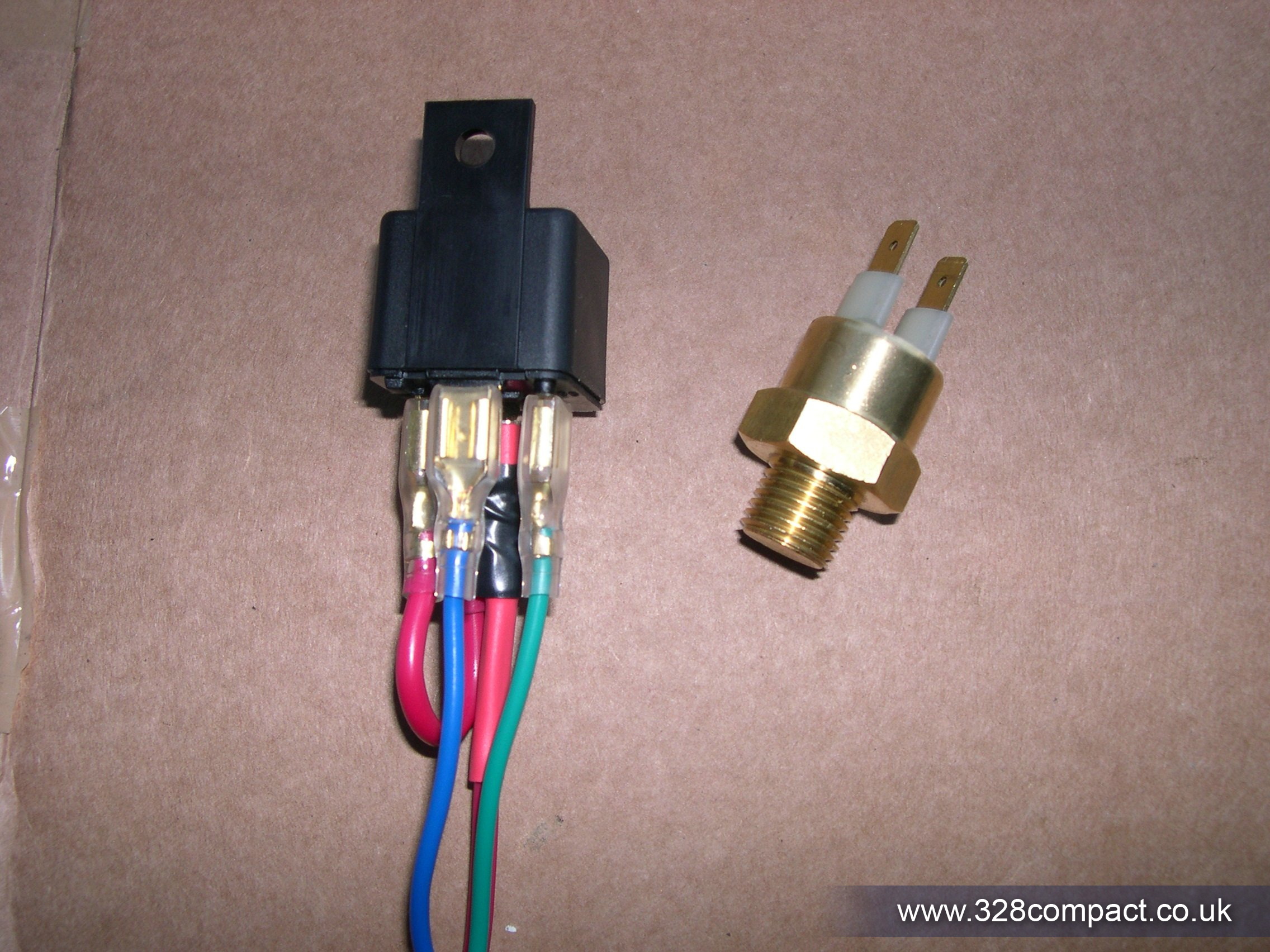 Thermostat & Electric Fan; Last year I replaced the viscous fan on my 1.6 with an electric fan and variable thermostat. This thermostat was installed inline with a water pipe from the engine to the radiator. Unfortunately this thermostat will not fit onto the new engine as the water pipe diameter is bigger. So I decided to get a thermostat plug for the radiator, this plug is set to turn on at 87C and off at 82C. It fits into the side of the radiator in the stock BMW location. The fan and thermostat were then wired into the car’s fuse box with a relay. This is a very tidy solution compared to the inline water pipe system.